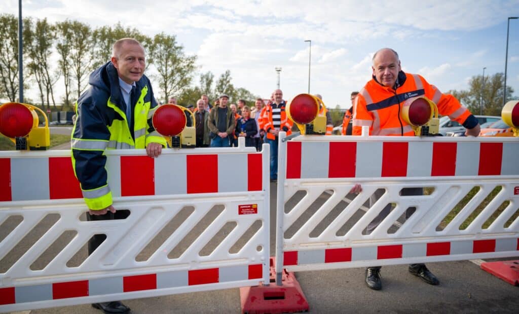 Dr. Gernot Tesch, ROSTOCK PORT-Geschäftsführer (links) und Ronald Normann, Direktor der Autobahn GmbH der Niederlassung Nordost (rechts) geben die neue Anschlussstelle Rostock-Industriehafen frei