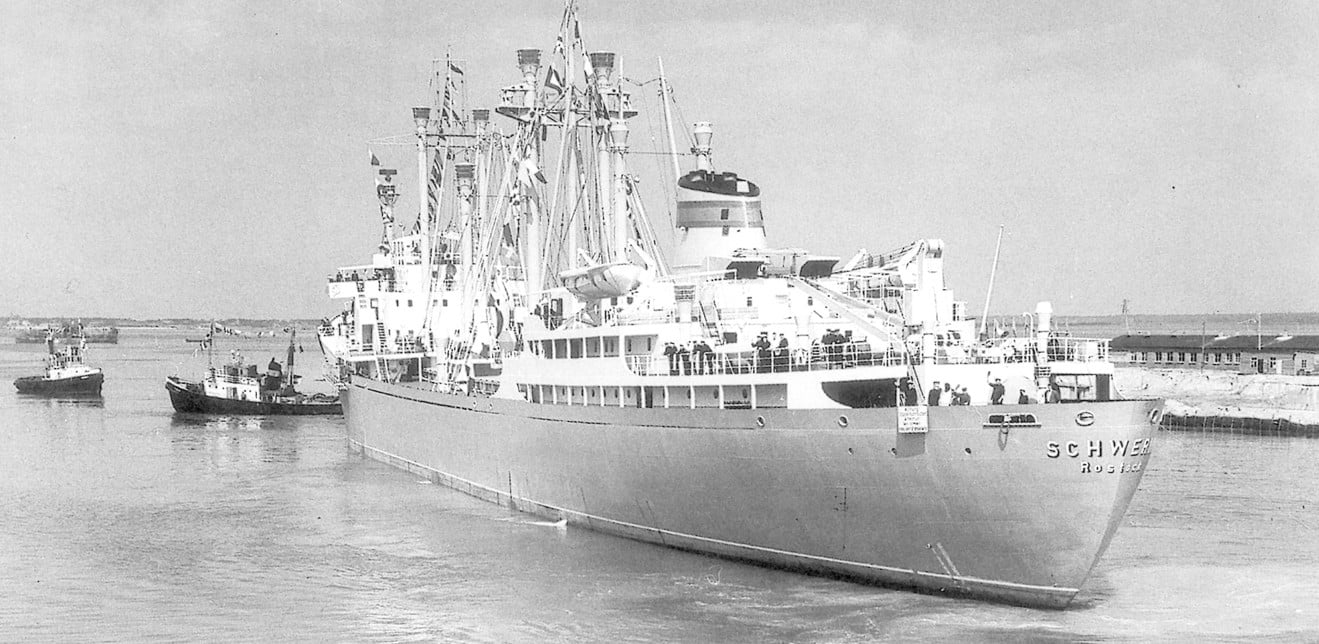 Am 30.04.1960 zur Hafeneinweihung wurde am Liegeplatz 31 die erste Hieve aus dem Motorschiff „Schwerin“ gelöscht.