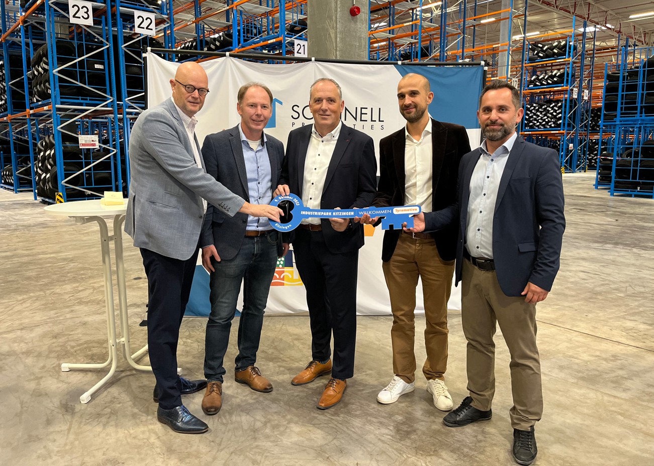 (Kitzingen) Das auf den Vertrieb von Reifen und Rädern spezialisierte Unternehmen Tyremotive feierte am vergangenen Montag den offiziellen Einzug in sein neues, hochmodernes Lager im Industriepark Kitzingen. Bei der feierlichen Schlüsselübergabe waren unter anderem Vertreter der Stadt Kitzingen, wie stellvertretende Landrätin Doris Paul und Bürgermeister Stefan Güntner, sowie Partnerunternehmen des Immobilienentwicklers Scannell Properties und dessen Managing Director DACH und Benelux, Jordan Corynen, zu Gast. Er war es auch, der den Geschäftsführern Henny Butter und Christian Leibold des international tätigen Felgen- und Reifengroßhändlers Tyremotive den symbolischen Schlüssel für ihre neue Lagerhalle überreichte.