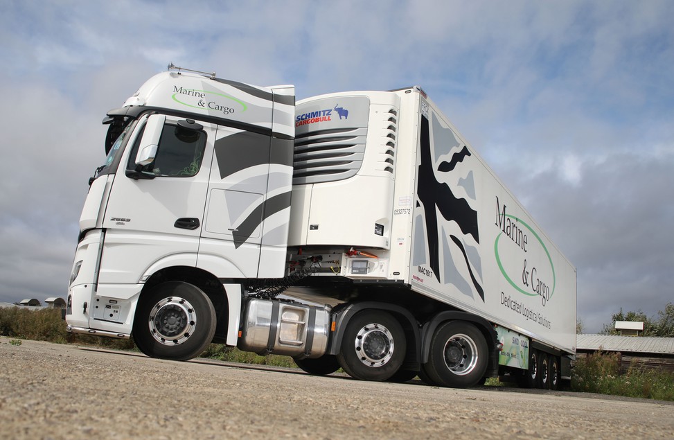 Der neue Kühlanhänger von Marine & Cargo ist mit der vollelektrischen Transportkältemaschine S.CU ep85 mit integrierter Leistungselektronik, einem Batteriesystem und einer elektrischen Generatorachse ausgestattet, die einen zu 100 Prozent emissionsfreien Betrieb ermöglicht. Das Unternehmen hat den S.KOe COOL mit einer Mercedes-Benz Actros Gigaspace-Zugmaschine kombiniert, die von einem kraftstoffsparenden 530 PS starken Euro VI-Motor angetrieben wird, der mit hydriertem Pflanzenöl (HVO) betrieben wird, um die Emissionen weiter zu reduzieren.