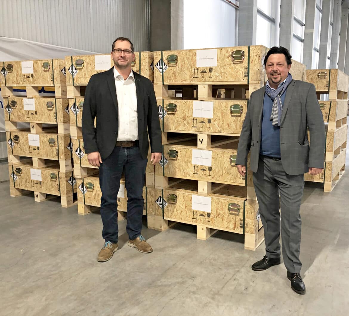 Bild: © Alfred Schuon GmbH / Bildlegende: Freuen sich über die Zusammenarbeit: Steffen Singer, Logistikleiter bei Schuon (links), und Carsten Rommelfanger, Business Development Manager bei Clasquin