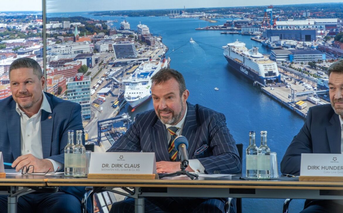 Foto: © Seehafen Kiel / Bildlgegende (v.l.n.r.): Mikko Juelich (Geschäftsführer der Stena Line Deutschland), Dr. Dirk Claus (Geschäftsführer Seehafen Kiel) und GeschäftsführerColor Line GmbH) an der Jahrespressekonferenz der Seehafen Kiel GmbH