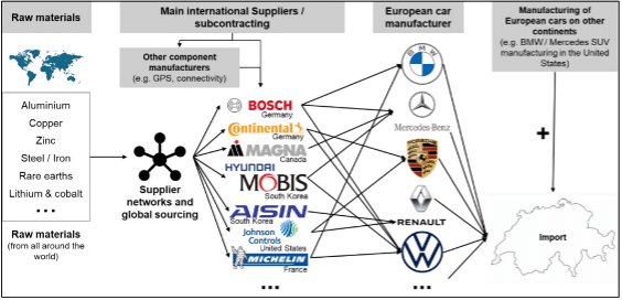 Die aktuelle LAE-Studie kommt zum Schluss, dass im internationalen Handel, d.h. zwischen der Schweiz und aussereuropäischen Ländern, zwischen 90% und 95% der Einfuhren und Ausfuhren zumindest teilweise per Seeschiff transportiert werden (siehe Abbildung 1). Betrachtet man die gesamte Prozesskette der importierten und exportierten Güter, kann von einer noch stärkeren Abhängigkeit der Importe und Exporte von der Hochseeschifffahrt ausgegangen werden. Begutachtet man Importe von Fahrzeugen aus dem europäischen Ausland, beispielsweise Fahrzeuge aus Frankreich oder Deutschland, so wird die Abhängigkeit von der Hochseeschifffahrt offensichtlich. Aufgrund der Vielzahl von Akteuren, Handelspartnern und Produktionsschritten sind die Prozessketten nicht nur für die Endkunden intransparent und somit schwer nachvollziehbar (siehe Abbildung 2). Die Darstellung möglicher Zulieferer-Netzwerke in der Automobilindustrie ist somit nur eines von vielen anschaulichen Beispielen.