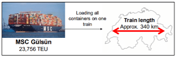 Die neue Seidenstrasse, bestehend aus Hochseehäfen, Umschlagsbahnhöfen und zigtausenden Kilometern Schiene aus China in die Welt, wird immer wieder als ernstzunehmende Konkurrenz für die internationale Seeschifffahrt bezeichnet. Im vergangenen Jahr konnte die Transportmenge um 500.000 TEU gesteigert werden. Für 2021 wird ein Wachstum von 20 % erwartet. Mittelfristig sollen trotzdem jedoch „nur“ 1 Million 20-Fuss-Standard Container transportiert werden. Im Gegensatz zum aktuellen Gesamtumschlag von 46 Millionen Containern in den europäischen Nordseehäfen ist die transportierte Containermenge auf der neuen Seidenstrasse damit verschwindend gering. Besonders eindrücklich wird der Vergleich, wenn man sich vorstellt, dass alle knapp 24.000 20-Fuß-Container (TEU) der vollbeladenen MSC Gülsün auf die Schiene verladen eine Zuglänge von ca. 340 km ergeben würden (siehe Abbildung 3). Auch fehlen heute noch weitergehend Umschlagskapazitäten zwischen Mitteleuropa und Asien. Fehlende Transportkapazitäten sowie die nachteiligen infrastrukturellen Rahmenbedingungen behindern also vorerst eine erfolgreiche Verlagerung von Transportkapazität auf die Seidenstraße.