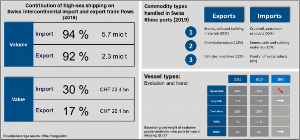 Trotz der räumlichen Nähe zum Mittelmeer wird noch immer ein Grossteil der für die Schweiz relevanten Handelsströme über die Nordseehäfen abgewickelt. Neben dem Hamburger Hafen sind besonders die Häfen der ARA-Range (Amsterdam, Rotterdam, Antwerpen) von besonderer Bedeutung für die Schweiz. Besonders Rotterdam mit der direkten Binnenschiffanbindung per Rhein nach Basel gilt als wichtiger Umschlagshafen für den Transport von flüssigen und trockenen Massengütern wie zum Beispiel raffiniertem Öl, Getreide oder Baustoffe. Im Containerverkehr zeichnet sich ein weiteres Wachstum, vor allem über die europäischen Nordseehäfen, ab. Umschlagskapazitäten in den Schweizer Rheinhafen sind somit eine wichtige Komponente für den multimodalen Verkehr in, aus und durch die Schweiz.