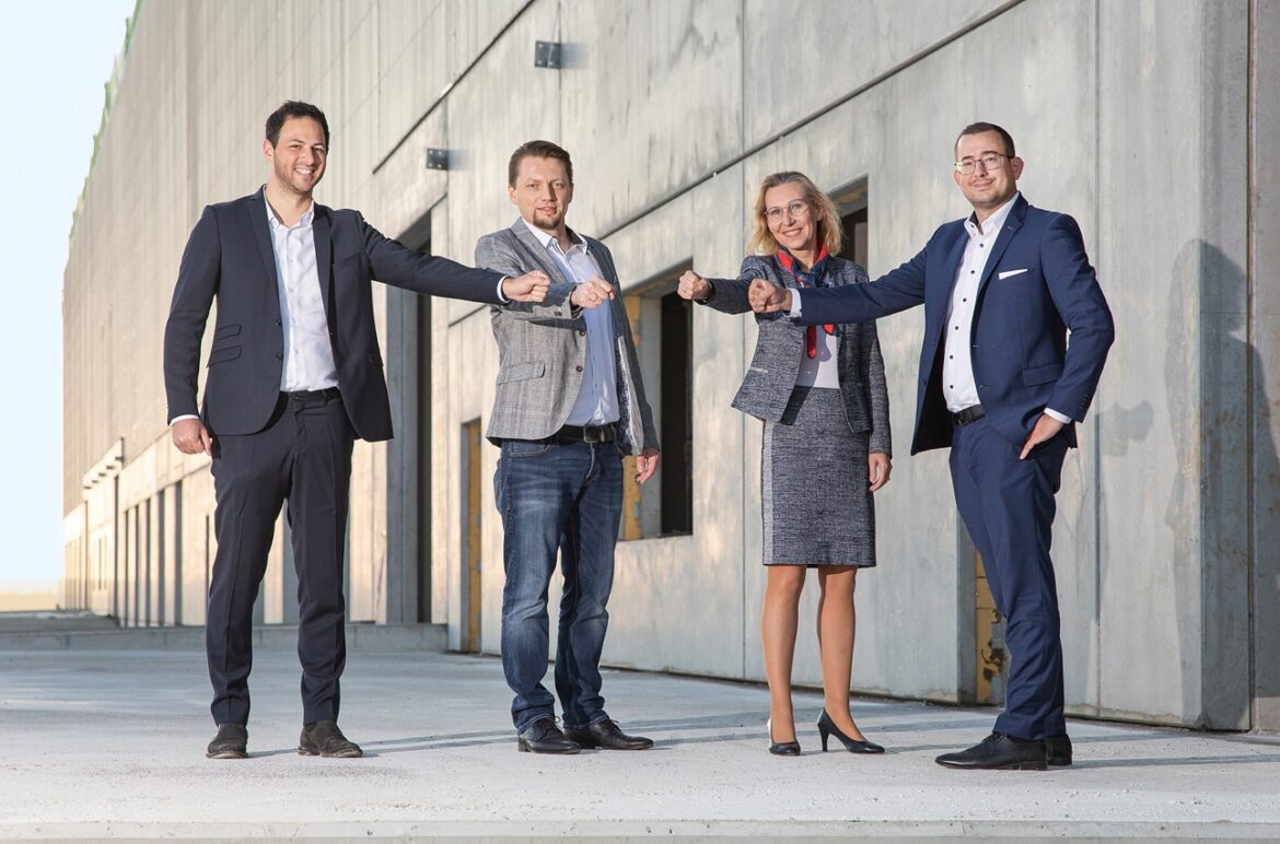 Foto: © Seifert / Bildlegende: Julian Seifert (Geschäftsbereichsleiter Spedition, Seifert Logistics Group), Arkadiusz Sikorski (External Warehouse Manager, Husqvarna Group), Dr. Kerstin van Kerkom (Director Supply Chain & Logistics, Husqvarna Group) und Axel Frey (COO, Seifert Logistics Group) beim Besuch des aktuell entstehenden Logistikzentrums Ulm Nord