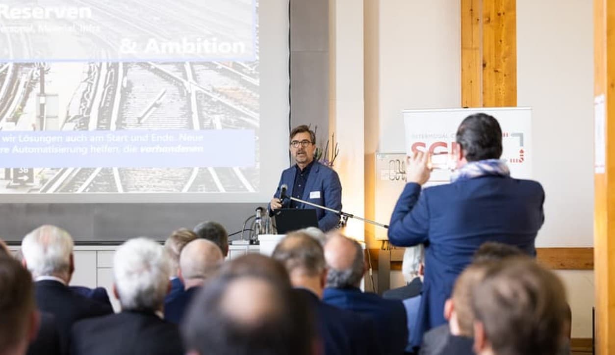 Foto: © SGKV / Bildlegende: SGKV-Vorstandsmitglied Michail Stahlhut (CEO Hupac) spricht am TerminalTag des SGKV