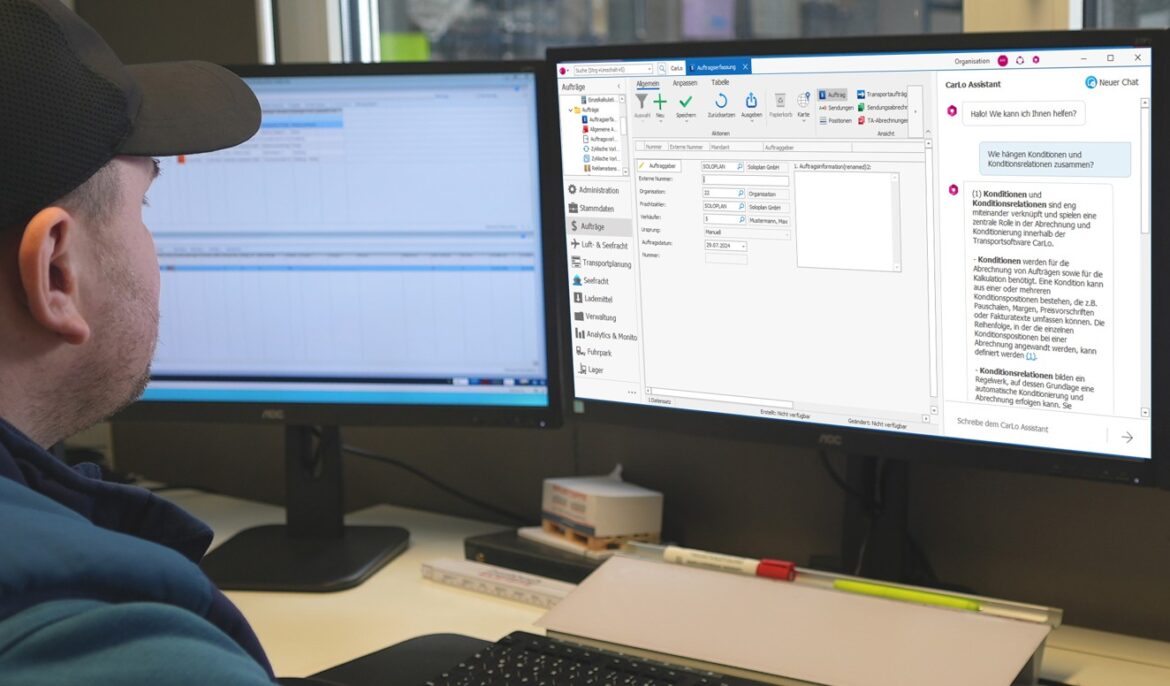 Das Softwarehaus Soloplan präsentiert mit CarLo Assistant ein neuartiges KI-Tool, das Nutzern des Transport Management Systems (TMS) CarLo smarte Hilfestellungen gibt. Die Funktion kann fachliche Fragen textuell beantworten. Die Künstliche Intelligenz fungiert hier wie eine textuelle Schnittstelle, die als Lowcode Plattform aus Texten entsprechende Logiken bauen kann.