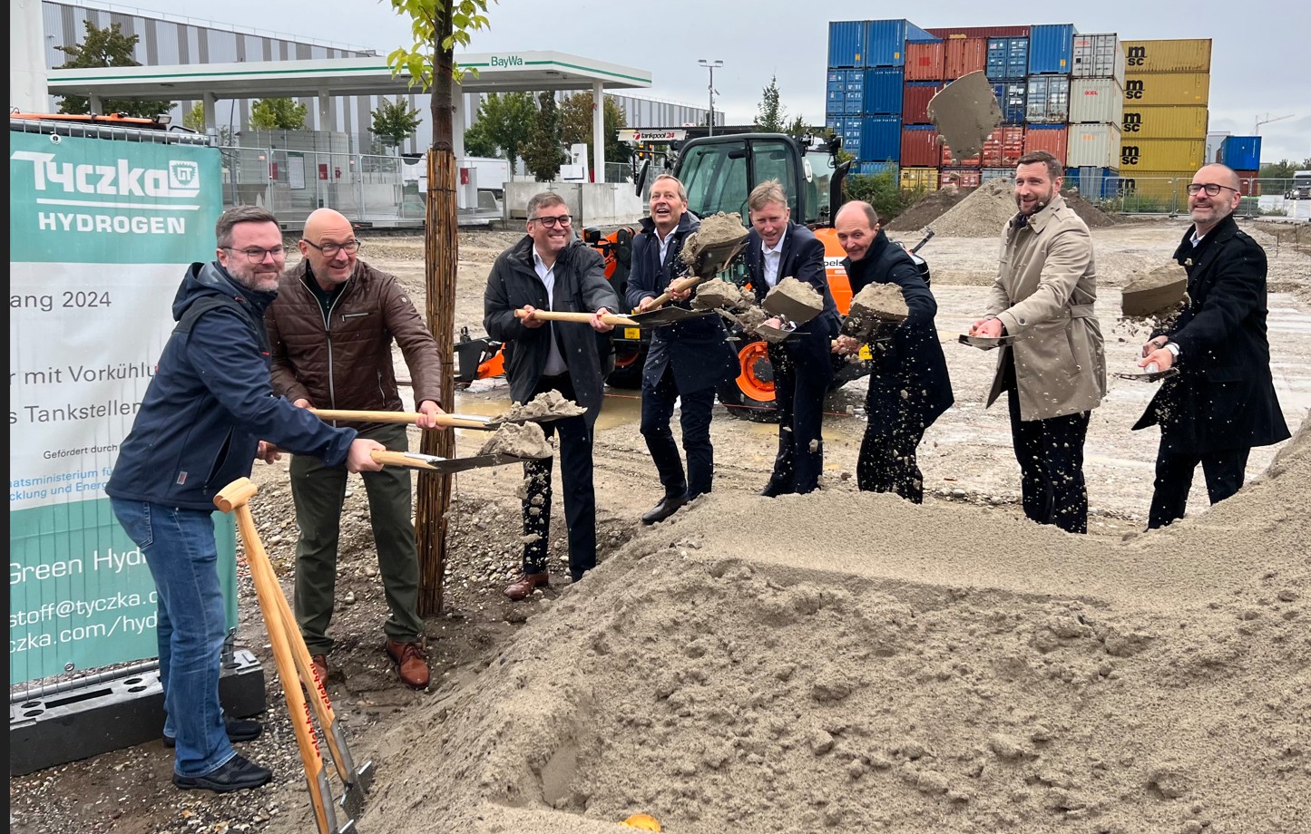 Alternative Antriebe auf dem Vormarsch: Im Güterverkehrszentrum (GVZ) Region Augsburg wird ab 2024 eine öffentliche Tankstelle Nutzfahrzeuge, Busse und Pkw mit grünem Wasserstoff versorgen. Tyczka Hydrogen hat am 22. September 2023 den Spatenstich für den Bau gesetzt.