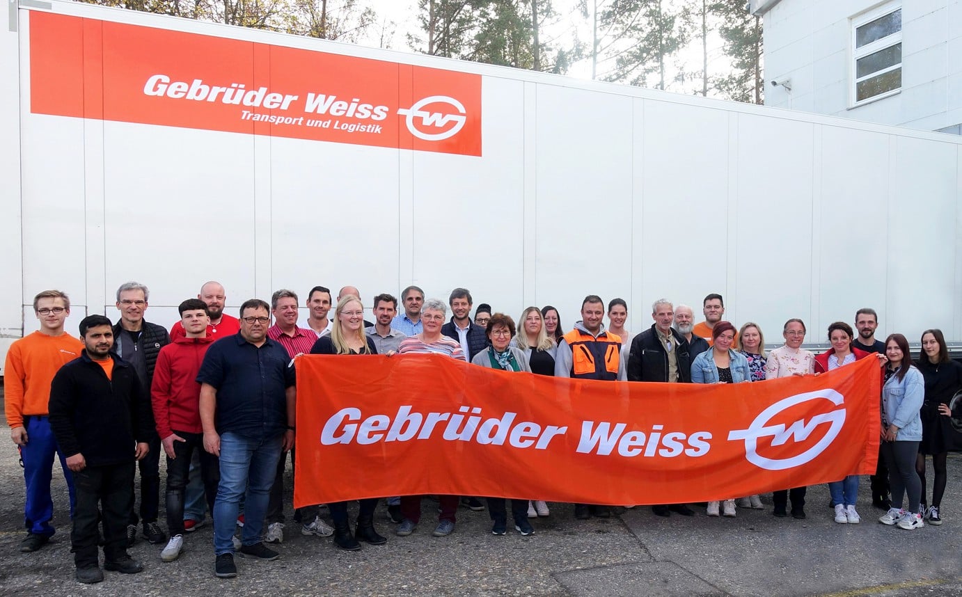 Foto: © Gebrüder Weiss / Bildlegende: Die Belegschaft der Niederlassung Waldkraiburg von Gebrüder Weiss zeigt Flagge