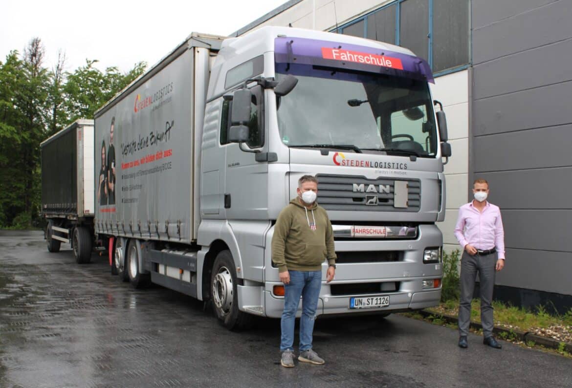 Foto: © Steden / Bildlegende: Claudio Steden (r.) heißt Stefan Klusenwirth herzlich willkommen im Team der Steden Logistik, für die der Kamener Fahrschulinhaber zukünftig die Ausbildungsleitung übernimmt.