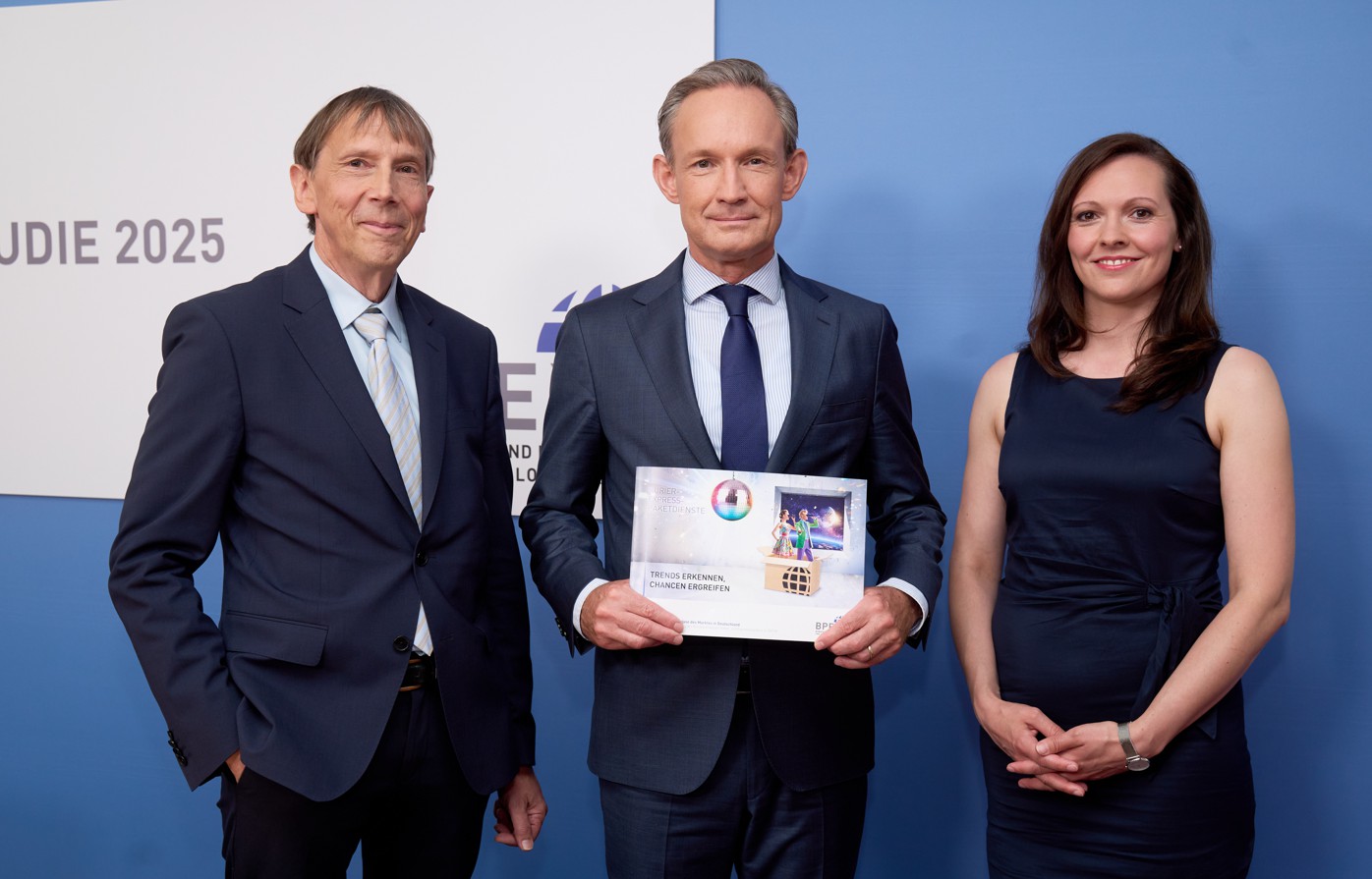 Foto: © BPEX / Bildlegende (v. l. n. r.): Dr. Klaus Esser (Autor der KEP-Studie 2025, KE-CONSULT Kurte&Esser GbR), Marten Bosselmann (Vorsitzender, Bundesverband Paket- und Expresslogistik), Heike Hoffert (Leiterin Kommunikation, Bundesverband Paket- und Expresslogistik); Fotograf: Frank Nürnberger