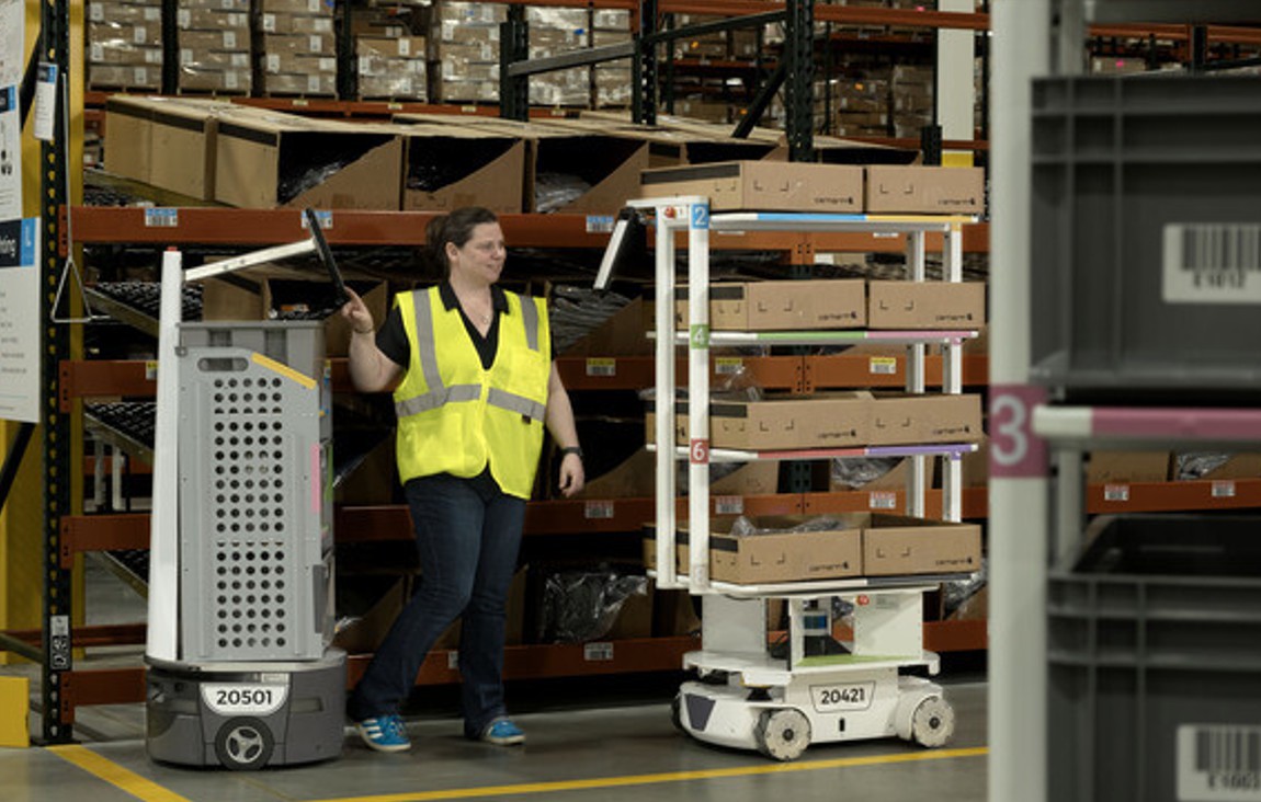 Foto: © Locus Robotics / Bildlegende: Die LocusBots Origin und Vector revolutionieren die Lagerlogistik: Während eine Mitarbeiterin die benutzerfreundliche AMR-Technologie im modernen Warehouse nutzt, steigern die flexiblen Roboter die Produktivität um das 2-3-fache und ermöglichen eine skalierbare, KI-gestützte Automatisierung für vielfältige Logistikanforderungen.
