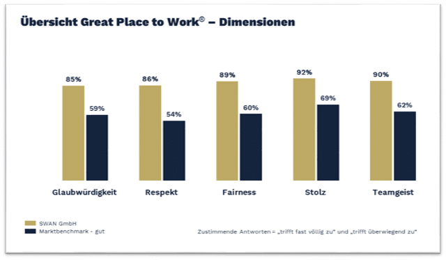 Überdurchschnittliche 85 Prozent der Mitarbeiter*innen stellten sich freiwillig der unabhängigen Prüfung des Instituts und zeichnen ein hervorragendes Bild des SAP-Projekthauses. Stolze 98 Prozent der SWAN-Angestellten, die teilgenommen haben, teilen die Aussage „Alles in allem kann ich sagen, dies hier ist ein sehr guter Arbeitsplatz”. Zudem hegen 96 Prozent der SWAN-Mitarbeiter*innen den Wunsch, noch lange hier zu arbeiten und 90 Prozent würden die SWAN als Arbeitgeber weiterempfehlen.