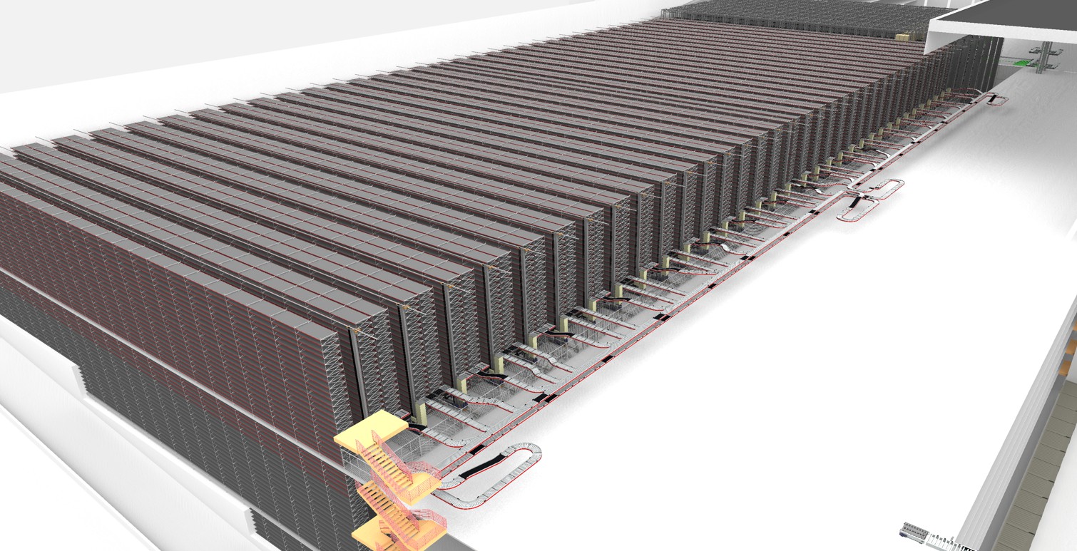 Was die Lösung von TGW Logistics technologisch einzigartig macht: 102 Mustang E+ Regalbediengeräte werden in drei Ebenen übereinander installiert, der Lagerblock ist damit beinahe 40 Meter hoch. Dieses Setup ermöglicht eine hohe Lagerdichte bei optimaler Leistung, zugeschnitten auf die Bedürfnisse von Ekol und seiner Kunden. Ein Netzwerk von vier Kilometern energieeffizienter Fördertechnik für Kartons und Paletten verbindet die einzelnen Bereiche miteinander – in der gesamten Anlage sind rund zehn Kilometer Fördertechnik verbaut.