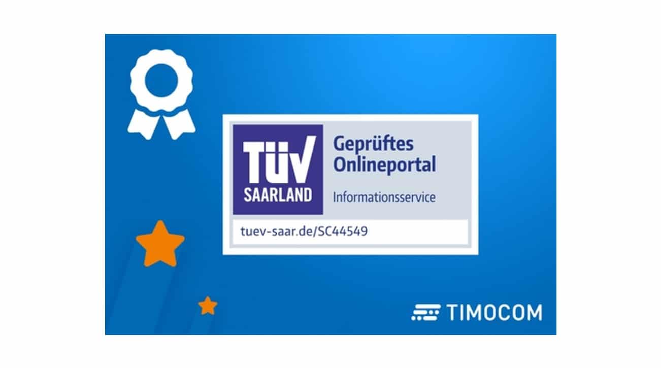 Der TÜV Saarland hat TIMOCOM für seine Website das Siegel „Geprüftes Onlineportal“ ausgestellt. Damit bestätigt die renommierte Prüforganisation die Einhaltung der, im Prüfkatalog vorgesehenen, gesetzlichen Anforderungen zum Schutz von Kundendaten, Transparenz, IT-Sicherheit und Nutzerfreundlichkeit. Die Webseite überzeugt durch Vollständigkeit und Verständlichkeit der Informationen, sowie durch die transparente Darstellung.