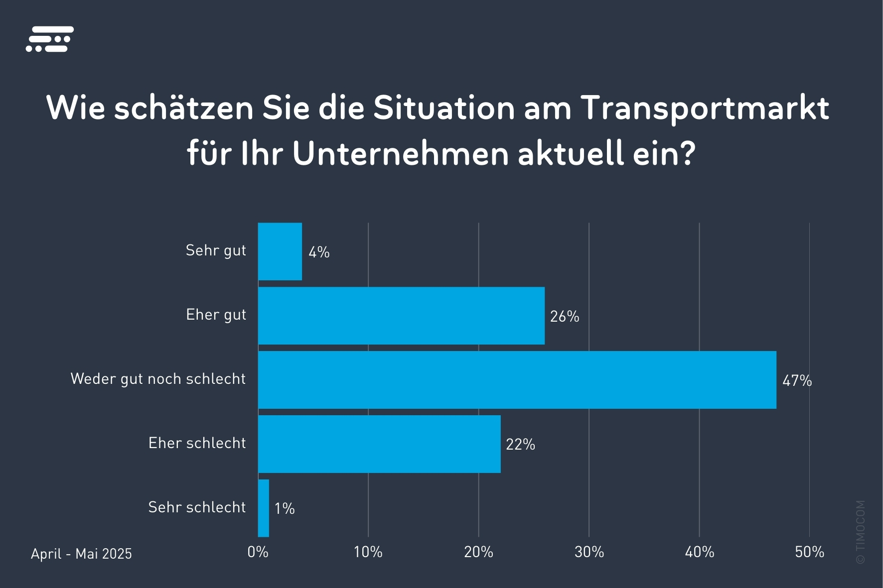 (Erkrath) Laut der Umfrage, an der rund 150 Fachleute aus den Bereichen Transport, Frachteinkauf und Beschaffung vom 10. April bis 15. Mai 2025 teilnahmen, schätzen 22% die Situation als eher schlecht und nur 1% als sehr schlecht ein. Lediglich 4% der Umfrageteilnehmer bewerten die Lage als sehr gut. Mehr als ein Viertel der Umfrageteilnehmer (26%) sieht die Situation als eher gut an. „Die Ergebnisse spiegeln die aktuell stagnierende wirtschaftliche Situation wider“, bewertet Gunnar Gburek, Head of Business Affairs bei TIMOCOM, die Ergebnisse der Befragung. „Die Zahlen verdeutlichen, dass die Mehrheit der Unternehmen mit einer mittelmäßigen und ungewissen Marktlage konfrontiert ist.“