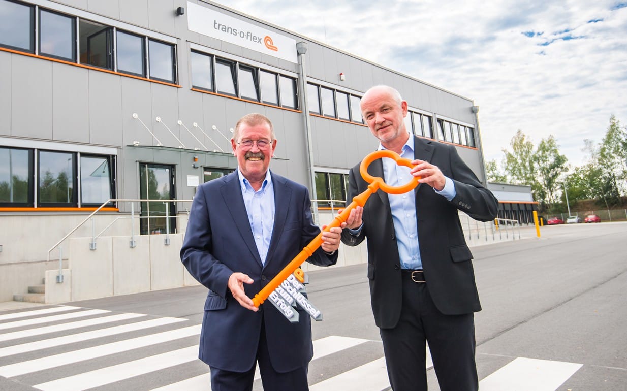 trans-o-flex-Geschäftsführer Wolfgang P. Albeck (links) übergab den sympolischen Schlüssel für den trans-o-flex-Standort in Wildenfels an Niederlassungsleiter Peter Morgenroth (© trans-o-flex)