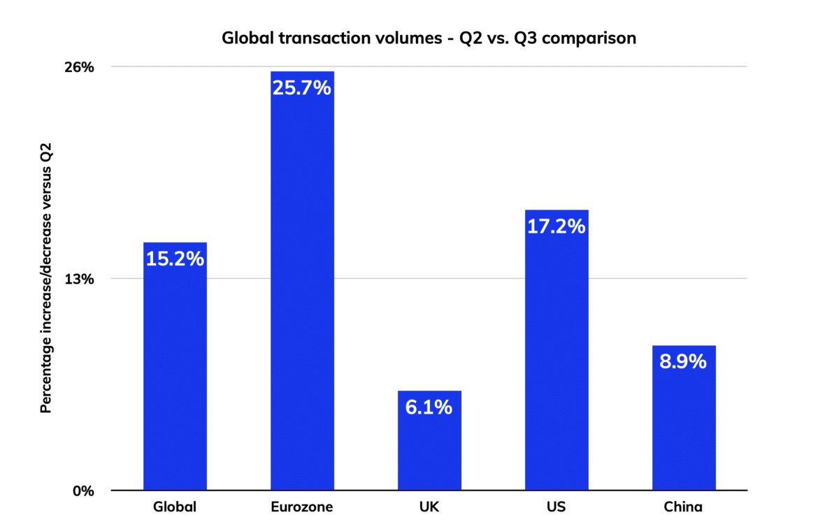 Weltweit stiegen die Bestellungen im 3. Quartal um 20,3%, aber das Rechnungsvolumen konnte mit einem Anstieg von nur 14,1% nicht Schritt halten. Die Eurozone ist die einzige Region, die den weltweiten Durchschnitt beständig übertrifft, vor allem dank eines deutlichen Anstiegs der Bestellungen am Ende des zweiten Quartals, der sich nun in Lieferantenbezahlungen niederschlägt.