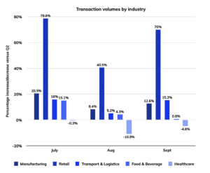 Ein Sektor, der von der Verlagerung auf den elektronischen Handel profitiert hat, ist der Transport- und Logistiksektor. Viele T&L-Unternehmen, waren in der Lage traditionellen B2B-Kuriertätigkeit auszugleichen, indem sie auf den elektronischen Handel umgestiegen. Die Handelsaktivitäten im gesamten Sektor waren während des kompletten zweiten Quartals relativ lebhaft geblieben und dies setzte sich auch im dritten Quartal fort.