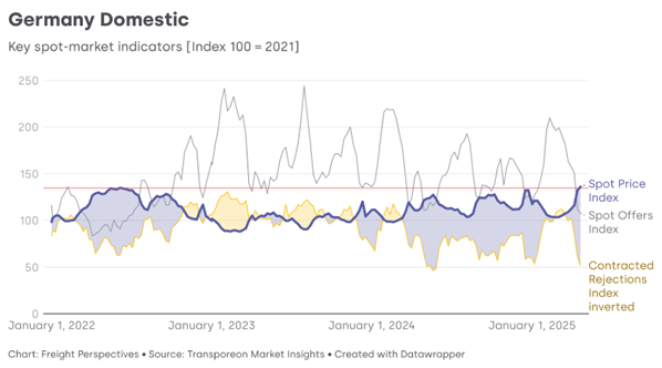 Obwohl Deutschland in den letzten zwei Jahren einen wirtschaftlichen Abschwung erlebt hat – eine Situation, die normalerweise zu niedrigeren Transportpreisen führt – sieht die Realität anders aus. Viele Marktteilnehmer sind angesichts der hohen Preise für kurzfristige Spot-Transporte innerhalb Deutschlands überrascht.