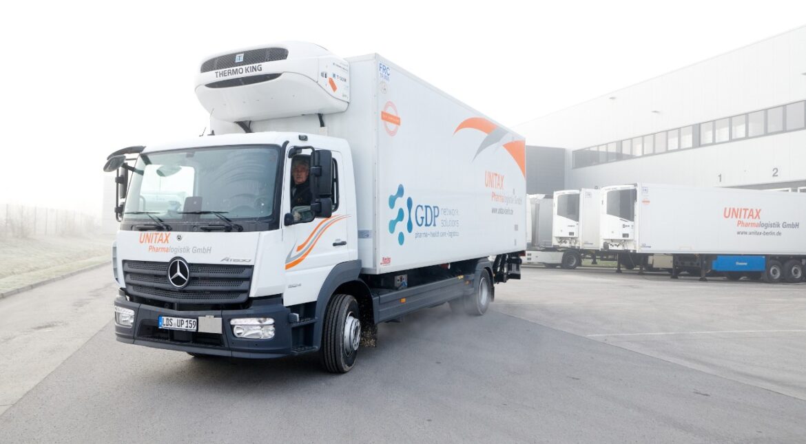 Der Logistikdienstleister Unitax setzt bei seiner Pharmalogistik auf einen Mercedes-Benz Fuhrpark. Sechs Atego und sechs Sprinter mit Kühlkoffer stellen die landesweite Impfstoffversorgung in Brandenburg sicher. Der temperatursensible Impfstoff stellt besondere Anforderungen an den Transport