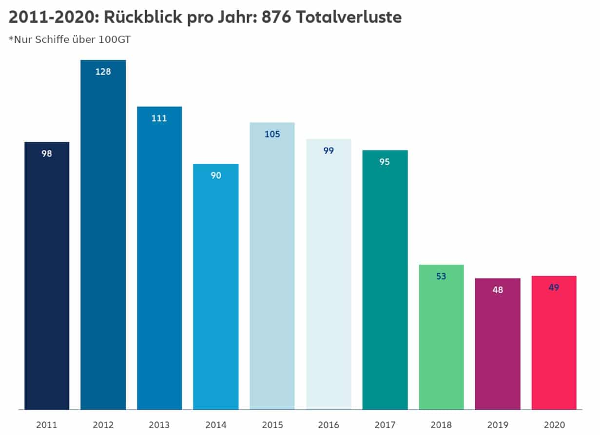 Die jährliche AGCS-Studie analysiert die gemeldeten Schiffsverluste und -unfälle (Zwischenfälle) über 100 Bruttoregistertonnen. Im Jahr 2020 wurden weltweit 49 Totalverluste von Schiffen gemeldet, ähnlich wie im Jahr zuvor (48) und die zweitniedrigste Gesamtzahl in diesem Jahrhundert. Dies entspricht einem Rückgang um 50 % innerhalb der zurückliegenden zehn Jahre (98 im Jahr 2011). Die Zahl der Schiffsunfälle sank von 2.818 auf 2.703 im Jahr 2020 (um 4 %). In den vergangenen zehn Jahren gab es insgesamt mehr als 870 Schiffsverluste.
