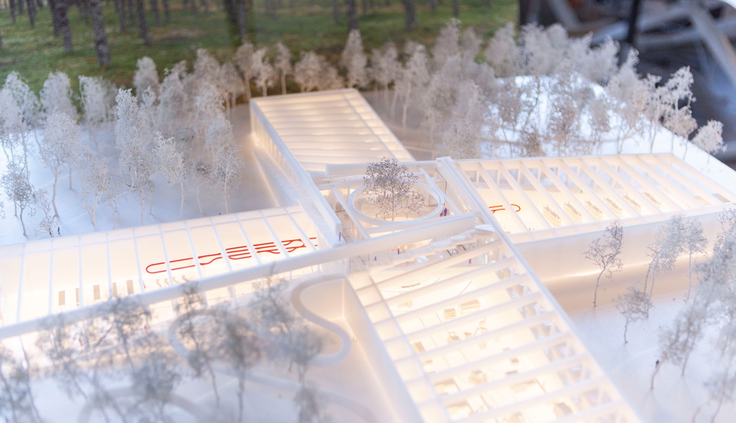 Vestre und BIG vereinte der Wunsch nach einem Gebäude, das ökonomisch, nachhaltig und sozial zugleich ist. An diesem Punkt war die Idee geboren, die Fabrik direkt in einen gepflanzten Kiefernwald zu betten und sowohl das Gebäude also auch die 300 Hektar Waldfläche als Erlebnisort für alle zugänglich zu machen. Besucher können bei Führungen die Möbelherstellung kennenlernen, sich über Energieerzeugung, Rückgewinnung, Wasseraufbereitung oder die Lebenszyklen der Materialien informieren. Zugleich sollen die Menschen die Ressource Wald erleben und haben die Möglichkeit zu picknicken und zu campen. Das Besondere an der gesamten Gebäudegeometrie von The Plus ist, dass man ringsum durch die riesigen Glasfassaden wie durch große Schaufenster direkt in die Produktion blicken kann. Und Zugänge zur offensten und transparentesten Fabrik der Welt gibt es viele. So führen zum Beispiel zwei 150 Meter lange, linear gegenläufige Fassadentreppen auf das 6.350 m² große Dach, von dem aus nicht nur die Flügel des kreuzförmigen Gebäudes einsehbar sind, sondern auch der zentrale runde Innenhof mit seinem solitären Ahornbaum. Dorthin führt eine kreisförmige Treppe. Wer Lust auf eine Rutschpartie hat, nimmt alternativ die Kurvenrutsche vom Dach nach unten.