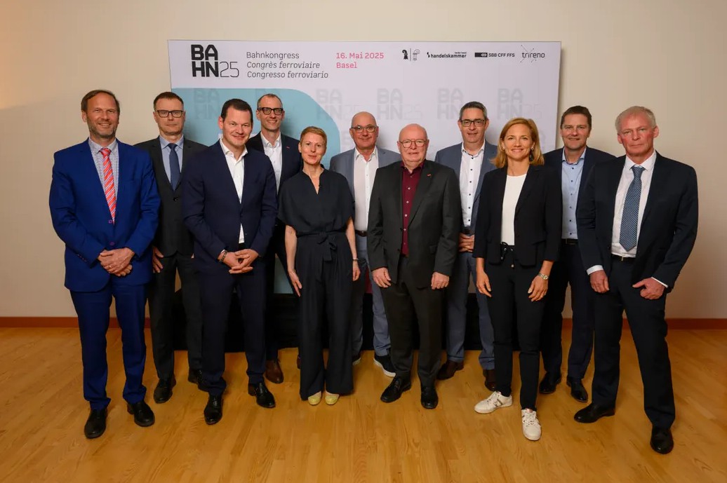Foto: © Bahn25 / Bildlegende: Sie sprachen unter anderen am Bahnkongress in Basel (v.l.n.r): Jörg Stefan, Referatsleiter Schienengüterverkehr, Bundesministerium für Verkehr Deutschland / Prof. Pawel Wojciechowski, EU-Koordinator Nordsee-Rhein-Mittelmeer-Korridor / Pierre Maudet, Staatsrat Kanton Genf / Alexander Muhm, Leiter Güterverkehr SBB AG / Christa Hostettler, Direktorin Bundesamt für Verkehr / Isaac Reber, Regierungspräsident Basel-Landschaft / Vincent Ducrot, CEO SBB AG / Martin Dätwyler, Direktor Handelskammer beider Basel / Esther Keller, Regierungsrätin Basel-Stadt / Stefan Luggen, Stv. Leiter Mobilität Kanton Wallis / Claudio Zali, Staatsrat Tessin
