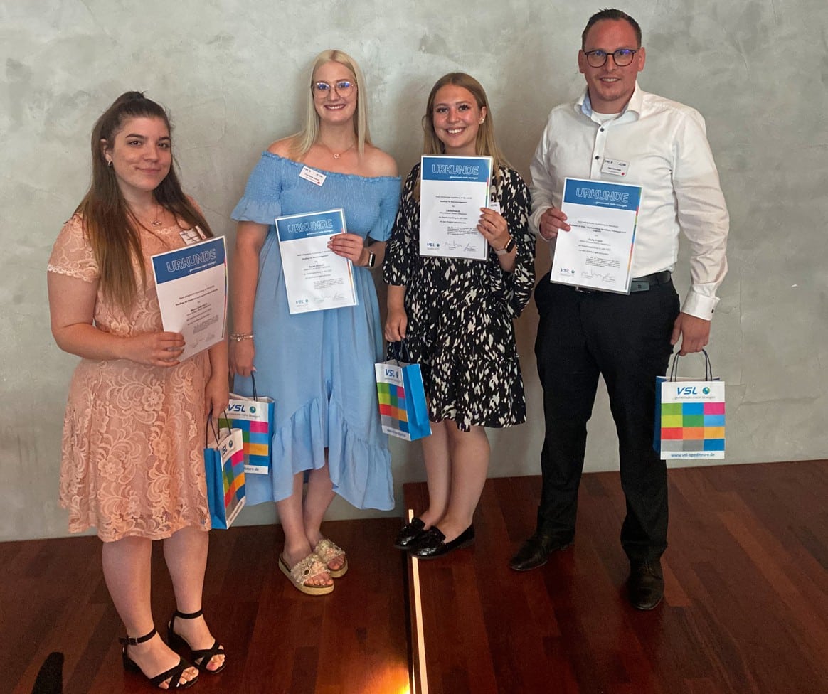 Die Ehrung war Teil der Jahresmitgliederversammlung des VSL, die erstmals wieder in Präsenz stattfand. „Wir gratulieren unseren Nachwuchskräften und freuen uns, dass sie diese individuelle Wertschätzung wieder auf großer Bühne entgegennehmen konnten“, resümiert Kreidler. Begleitet wurden ihre Schützlinge von Geschäftsführer Theo Schuon und Rolf Berkowitz, Kaufmännischer Leiter. Besonders stolz ist die Ausbildungsleiterin, dass alle vier Absolventinnen und Absolventen Schuon auch weiterhin treu bleiben. „Eine zukunftsorientierte Branche sowie gute Übernahmechancen sind für viele junge Menschen das Zünglein an der Waage. Schuon bietet beides“, sagt Kreidler.
