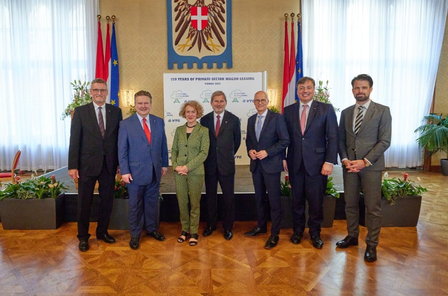 Nach einer Begrüßung durch Hannes Kotratschek, Geschäftsführer VTG Rail Europe GmbH, sprachen die Schirmherren und Dr. Johannes Hahn, EU-Kommissar für Haushalt und Verwaltung. Die Perspektive der Branche brachten Dr. Heiko Fischer, UIP-Präsident und ehemaliger VTG-Vorstandsvorsitzender, und Sven Wellbrock, Chief Operating Officer Europe & Chief Safety Officer der VTG AG, ein. EU-Kommissar Hahn unterstrich: „Der Schienengüterverkehr spielt eine Schlüsselrolle für den Wandel hin zu einem grüneren, digitaleren und resilienteren Europa. Jede Investition in die Schiene ist eine Investition in die Zukunft, die auf nachhaltige Weise dazu beiträgt, Europa menschlich wie wirtschaftlich zu verbinden.“
