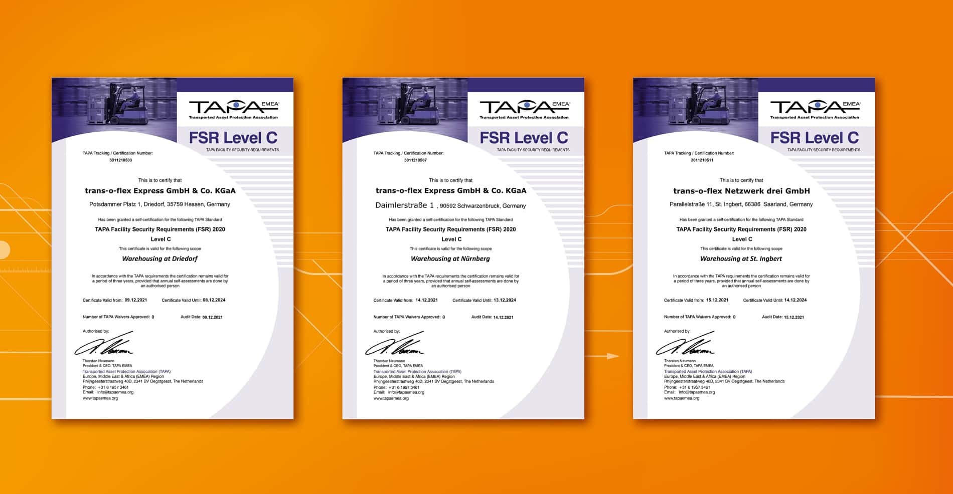 Die Standorte sind nach der TAPA-Norm FSR-C 2020 zertifiziert. „Dieser Standard ist anspruchsvoller als alles, was es im ISO-Qualitätsmanagement an Sicherheitsvorgaben gibt. Er ist die ideale Grundlage für die weitere Entwicklung unserer Sicherheitsprozesse und -technik“, erläutert Wolfgang P. Albeck, CEO von trans-o-flex. „Höchste Sicherheitsstandards sind für ein Unternehmen, das sich auf den Transport sensibler Güter konzentriert, lebenswichtig“, sagt der Firmenchef. „Fast genauso wichtig ist es aber, das erreichte Niveau nach außen zu dokumentieren.“