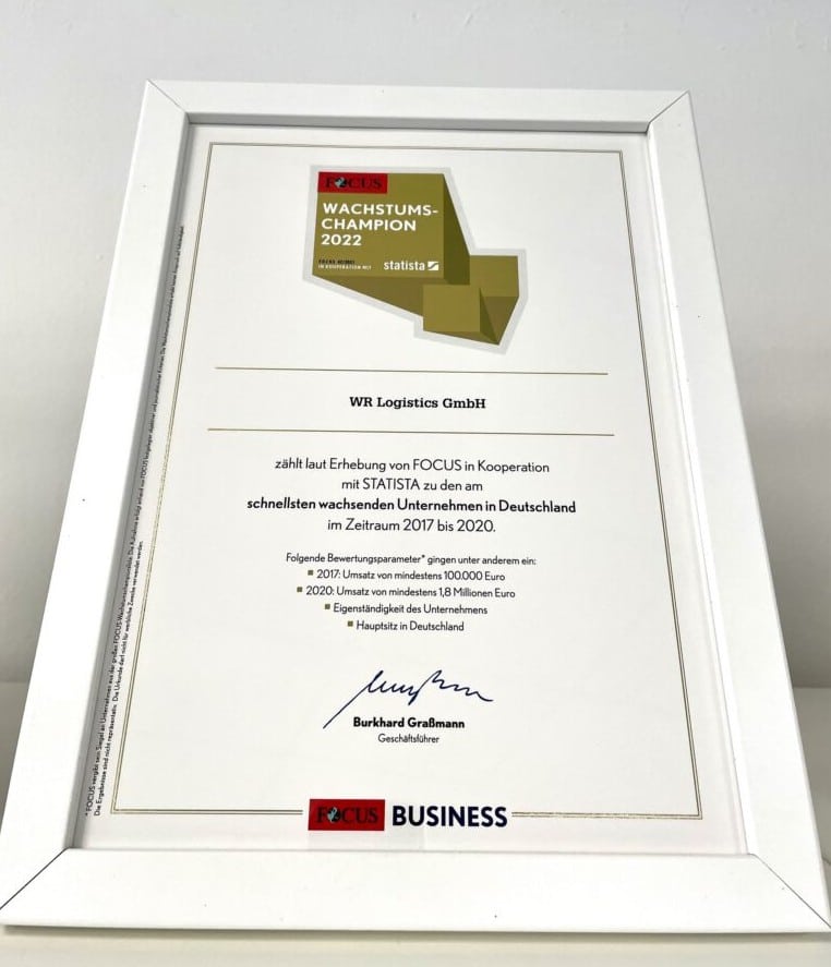 WR Logistics GmbH ist in der TOP-10 Liste von 500 deutschen Unternehmen, die von FOCUS und Statista als die am schnellsten wachsenden identifiziert wurden. FOCUS Wachstumschampion ist eine Auszeichnung für innovative Vorantreiber aus über 20 Branchen. Seit mehreren Jahren ermittelt Focus Business gemeinsam mit dem Hamburger Marktforschungsinstitut Statista die Wachstumschampions Deutschlands. Gemessen wird dabei am Umsatzwachstum des Unternehmens in den letzten 3 Jahren.