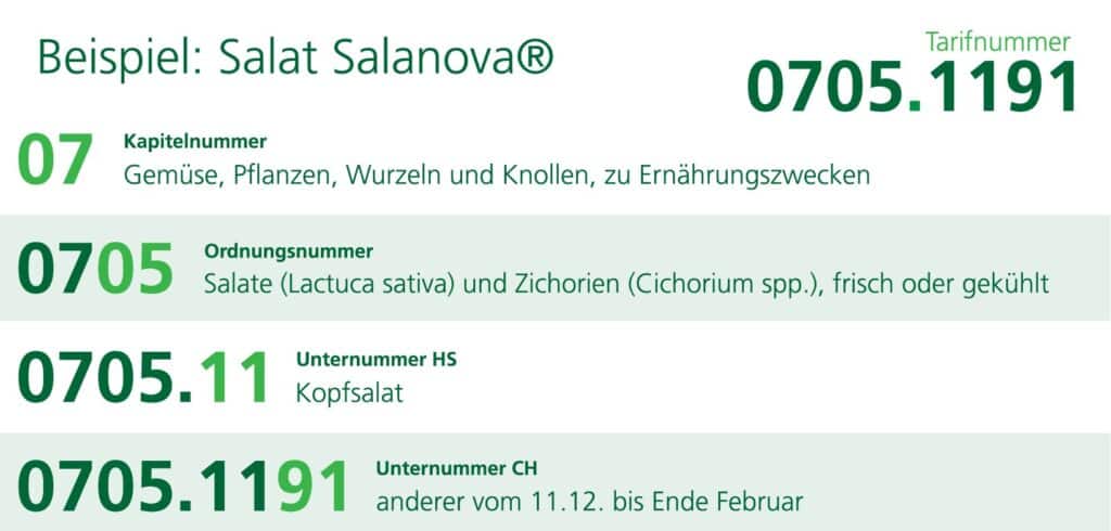 Vor einigen Jahren sollte die neue Salatzüchtung Salanova® in die Schweiz eingeführt werden. Doch wie importiert man eine ganz neue Ware, der noch keine Tarifnummer zugewiesen wurde? Denn kein Importvorgang kommt ohne diese Nummer aus. Nicht nur definiert sie das Produkt international verständlich. Aus ihr geht auch hervor, wie viele Zollabgaben anfallen, ob eine Ware allenfalls zollfrei eingeführt werden kann oder ob Kontingente gelten. Für den Importeur bedeutet dies, dass er bei der Deklaration keine Fehler machen sollte, andernfalls können Nachforderungen und Bussen folgen.
