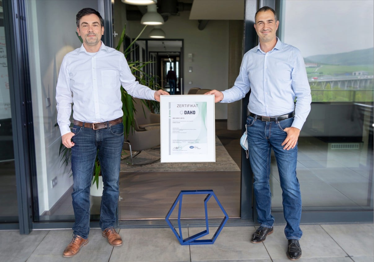 Foto: © DAKO GmbH / Bildlegende: Thomas Becker (r.) und Martin Dittmar (l.), Geschäftsleitung der DAKO GmbH, freuen sich über die Bestätigung des Qualitätsmanagement-Zertifikats.